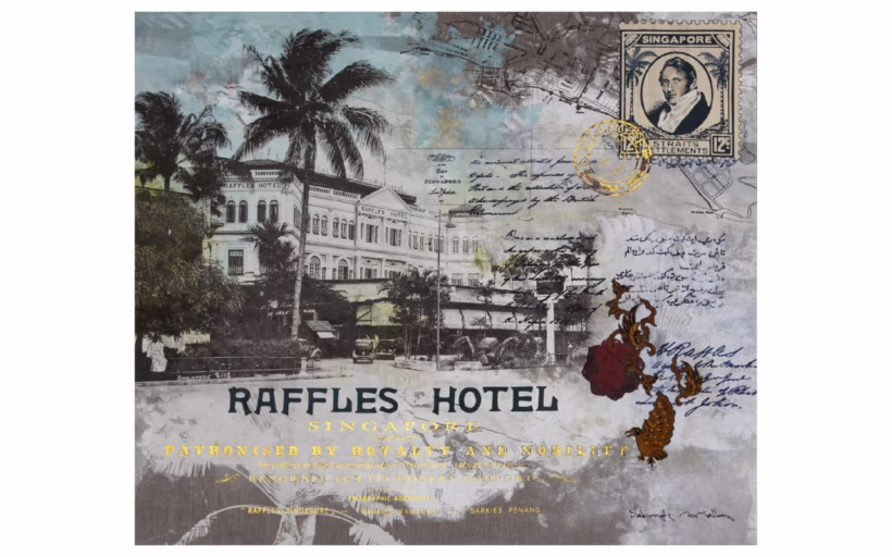 If you ever find yourself in the Presidential Suite of Raffles Hotel Singapore, you may find your eyes drawn to an intriguing piece adorning the walls. The mixed-media artwork in question, which exudes a warm vintage feel, features unique design elements including a photograph of the hotel’s iconic façade and a portrait of Stamford Raffles in the style of a Straits Settlements stamp. Blended together on canvas using acrylic painting, silkscreen printing and stitch work, these elements tell an evocative tale that transports the viewer back to Singapore of yesteryear.