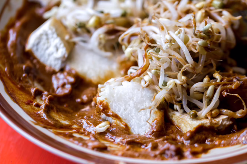 Reproductive health duly attended to, we head to the Tipat Tahu Gerenceng warung (9 Jln Sutomo; above), whose main signature dish is a combination of bean sprouts, tofu, egg, rice cakes and peanut sauce first popularised in East Java. “Traditionally Balinese food was very simple: grilling, stewing, smoking, braising, using found and foraged ingredients,” says Meyrick. “The arrival of the Chinese brought noodles, fried food and more variety.”